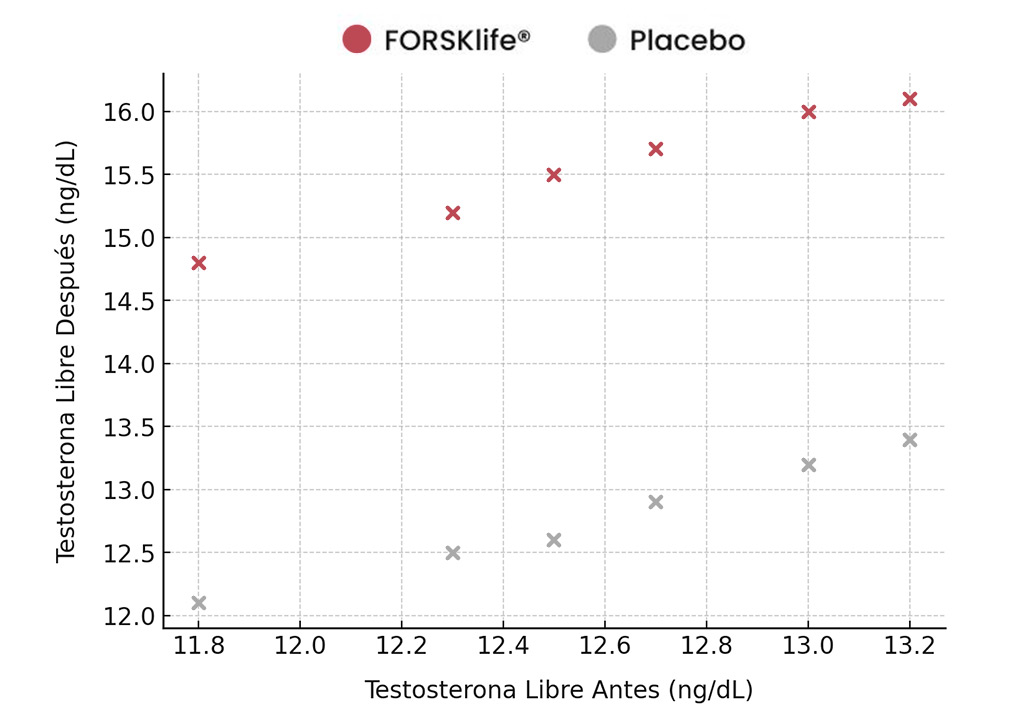 Incremento en los niveles de testosterona libre: Cambios en los niveles de testosterona libre con FORSKlife® en comparación con un placebo. Se observa un incremento significativo en los niveles de testosterona libre en el grupo suplementado, lo que sugiere un posible efecto estimulante sobre la producción hormonal, con beneficios en rendimiento físico, composición corporal y bienestar general.