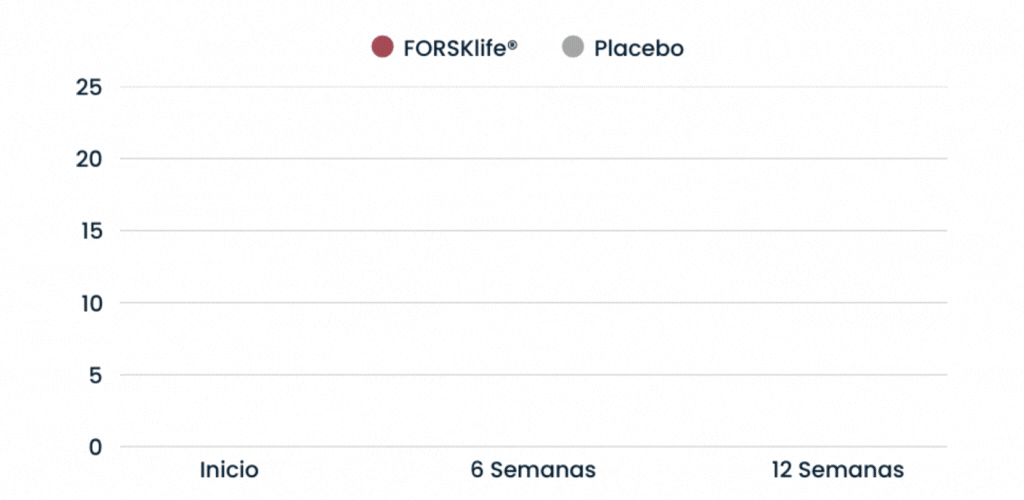 Reducción del porcentaje de grasa corporal con FORSKlife® en comparación con un placebo durante 12 semanas. Se observa una reducción significativa de la grasa corporal en el grupo que tomó FORSKlife®, mientras que el placebo mostró un cambio mínimo. Esto sugiere que la forskolina podría favorecer la movilización de grasas y la composición corporal cuando se combina con un estilo de vida saludable.