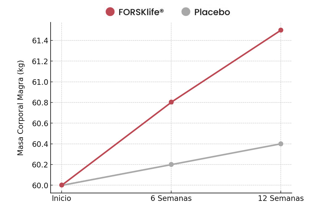 Cambio en la masa corporal magra en participantes que tomaron FORSKlife® frente a placebo durante 12 semanas. Se observa un incremento de aproximadamente 1,5 kg en el grupo suplementado, mientras que el grupo placebo mostró un aumento mínimo. Estos resultados sugieren que FORSKlife® podría favorecer la preservación y ganancia de masa magra en un contexto de entrenamiento y alimentación adecuada.