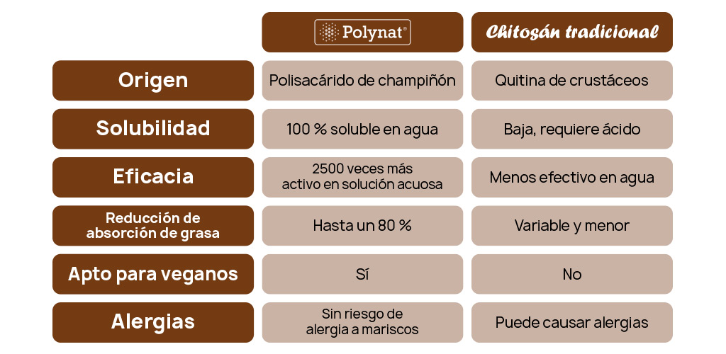 Polynat® es una marca registrada de NATURingredients que contiene un polímero natural de origen no animal, derivado de polisacáridos de extracto de champiñón (Agaricus bisporus), diseñado para reducir la absorción de grasas y favorecer el control calórico. Gracias a su alta solubilidad en agua y su tecnología patentada, se posiciona como una de las opciones más innovadoras y efectivas del mercado. Polynat® cuenta con propiedades avanzadas para la retención de grasas en el tracto digestivo. Su mecanismo de acción permite atrapar lípidos y evitar su absorción, ayudando a reducir el impacto calórico de la dieta. Se diferencia del chitosán convencional porque: