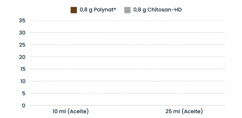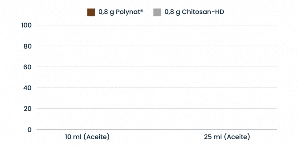 En la primera gráfica, Polynat® en solución acuosa logra retener el 100 % de la grasa cuando la cantidad de aceite es de 10 ml y 25 ml, mientras que Chitosan-HD solo retiene alrededor del 4 %.
