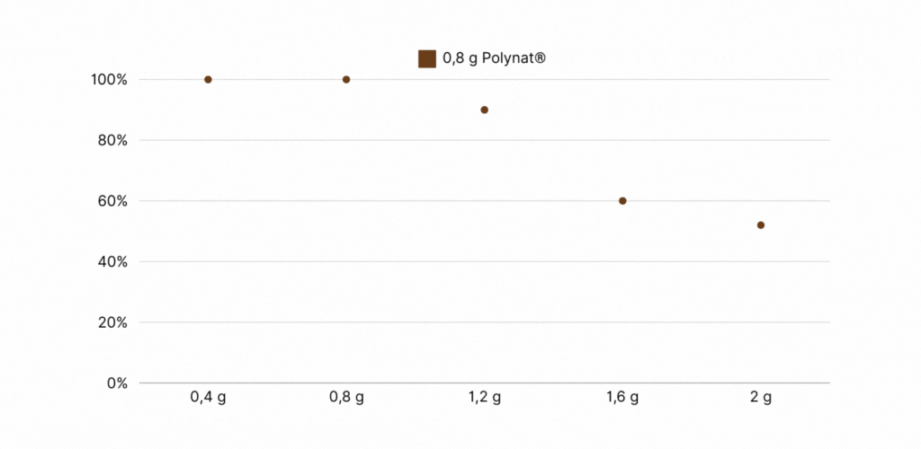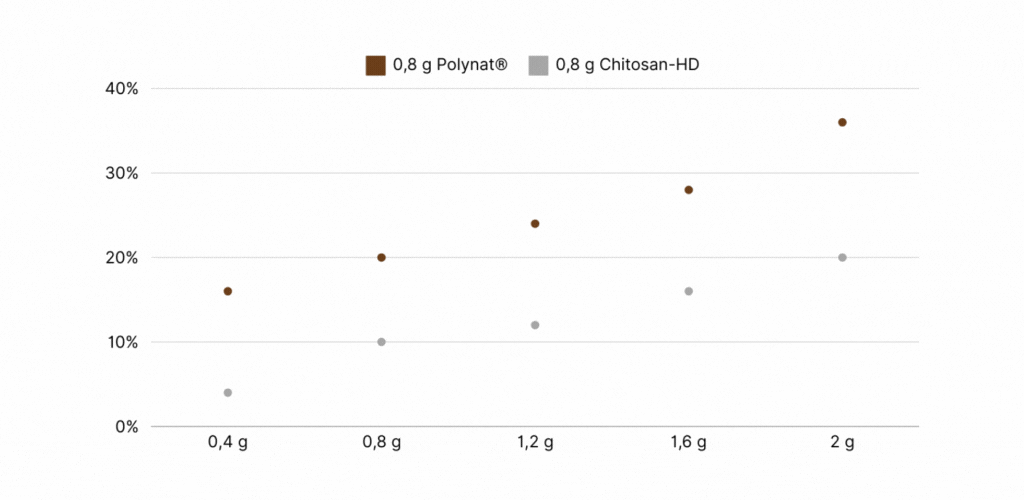 Polynat® demuestra una capacidad de absorción de grasa significativamente mayor en comparación con Chitosan-HD. En forma de polvo, Polynat® también supera al chitosán tradicional en la retención de grasas, alcanzando un 36 % de reducción de absorción en comparación con el 20 % del chitosan.
