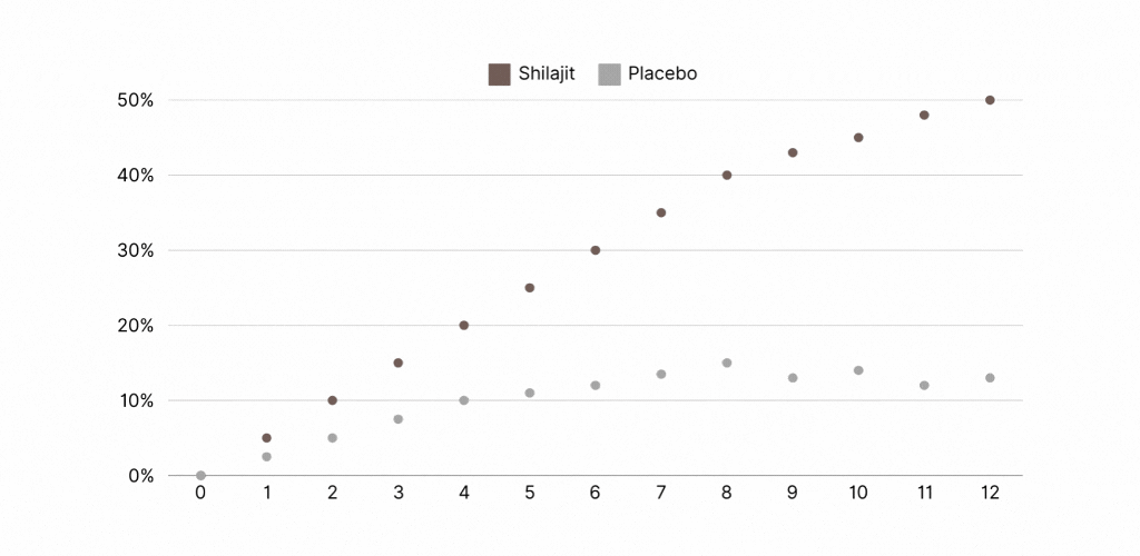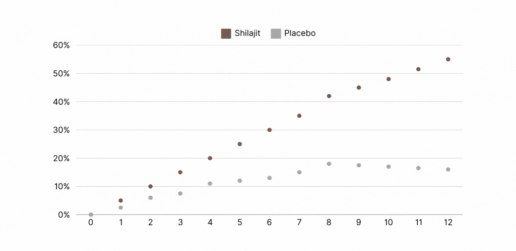 En este gráfico se observa un aumento significativo del % en la energía con el uso de shilajit en comparación con el placebo, en un estudio de 12 semanas de duración.